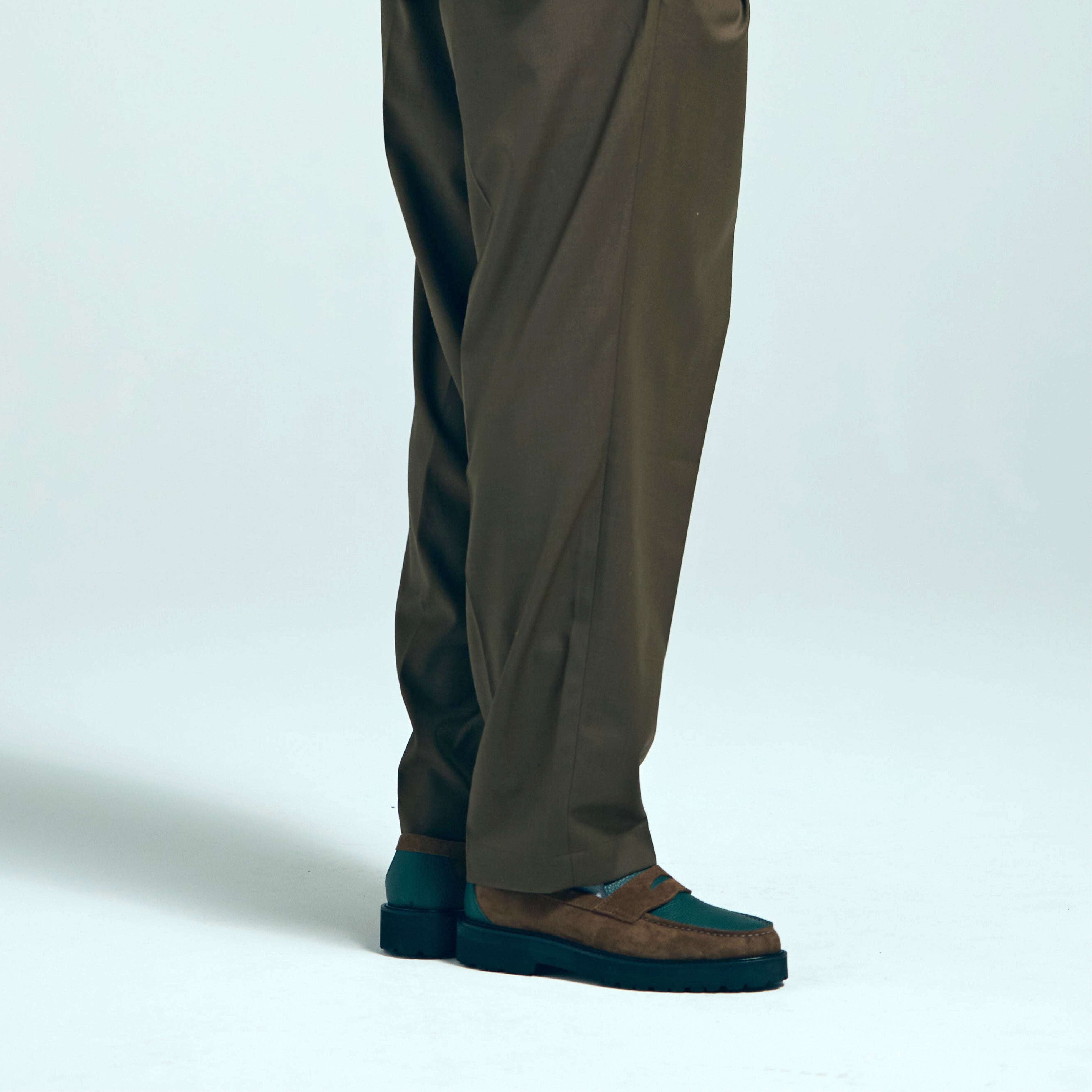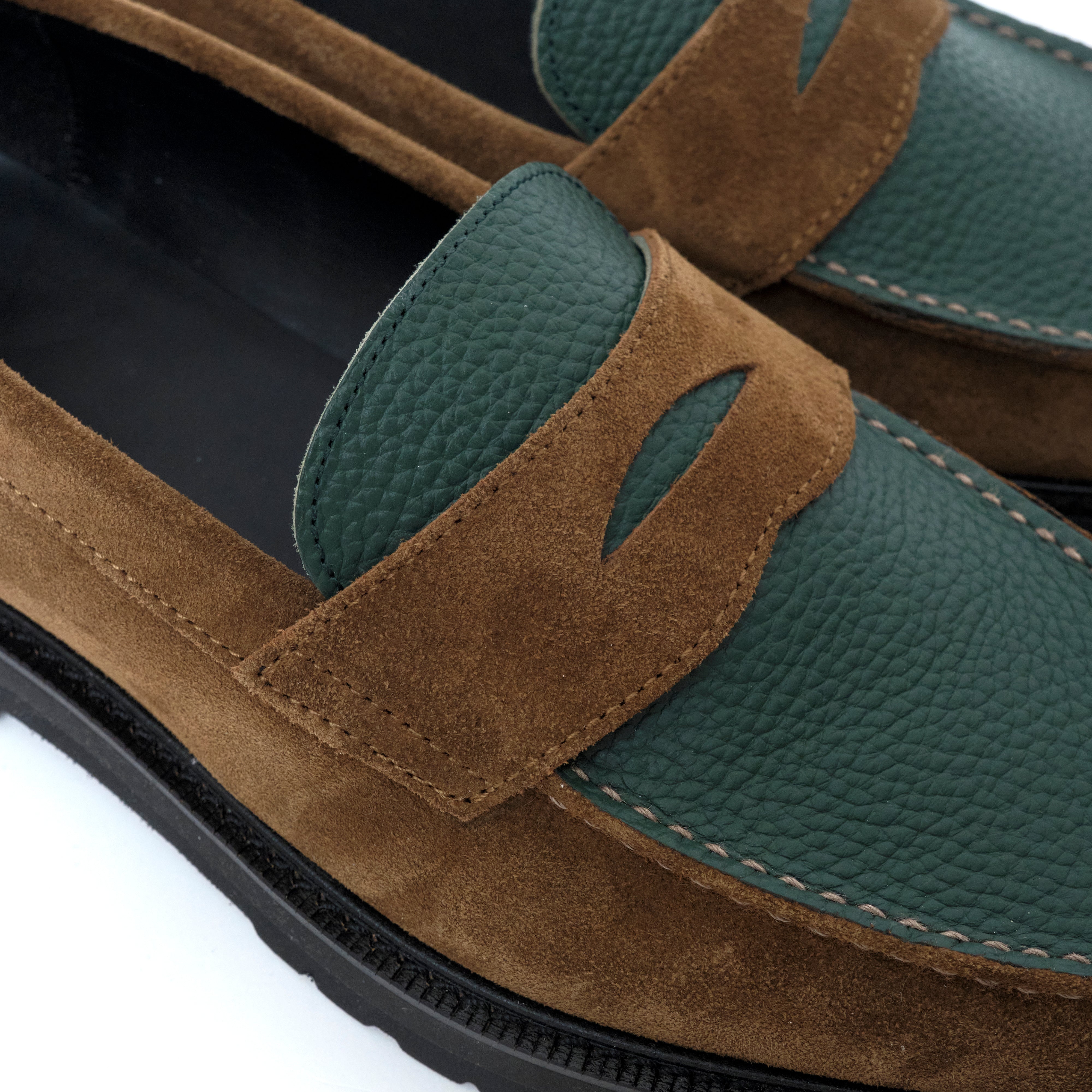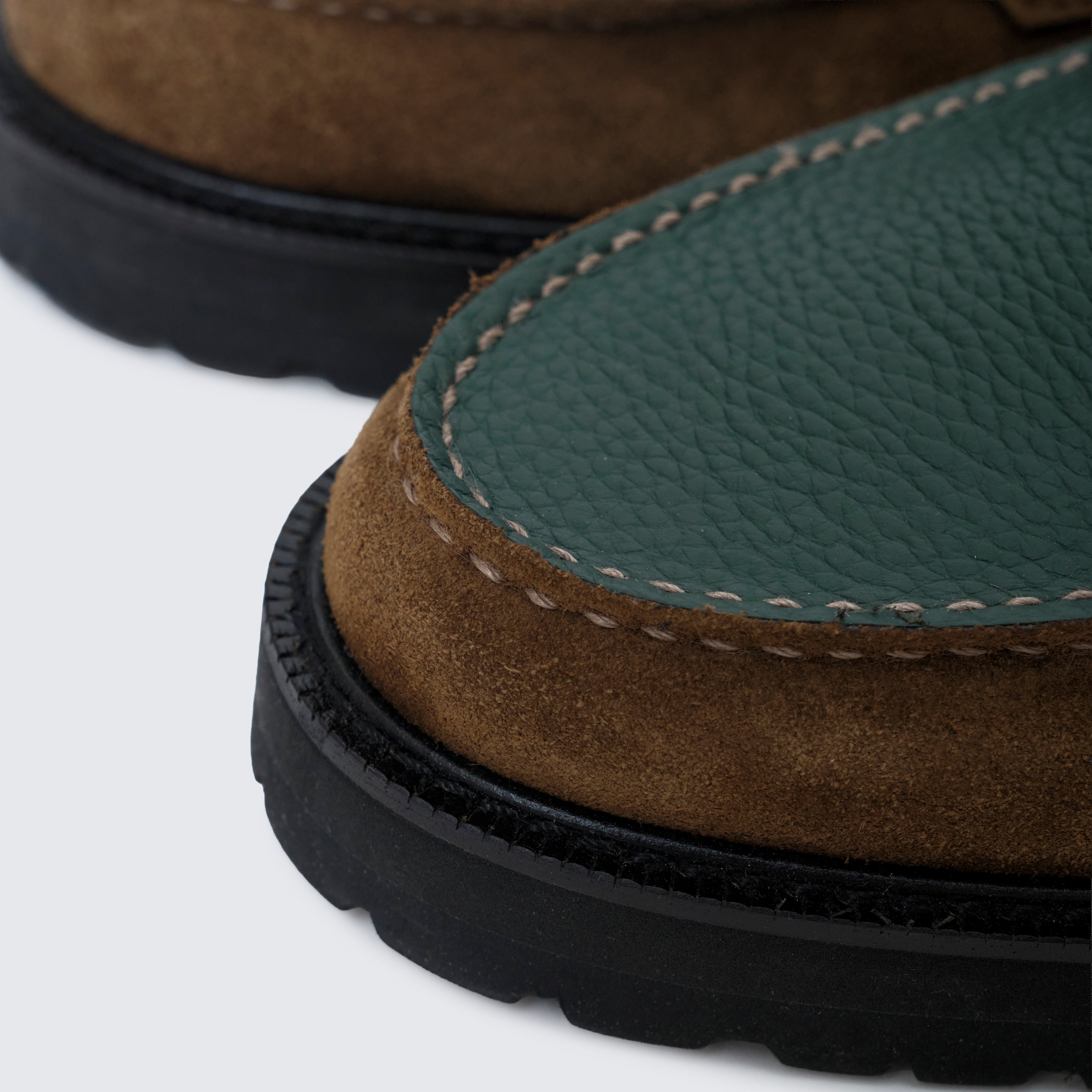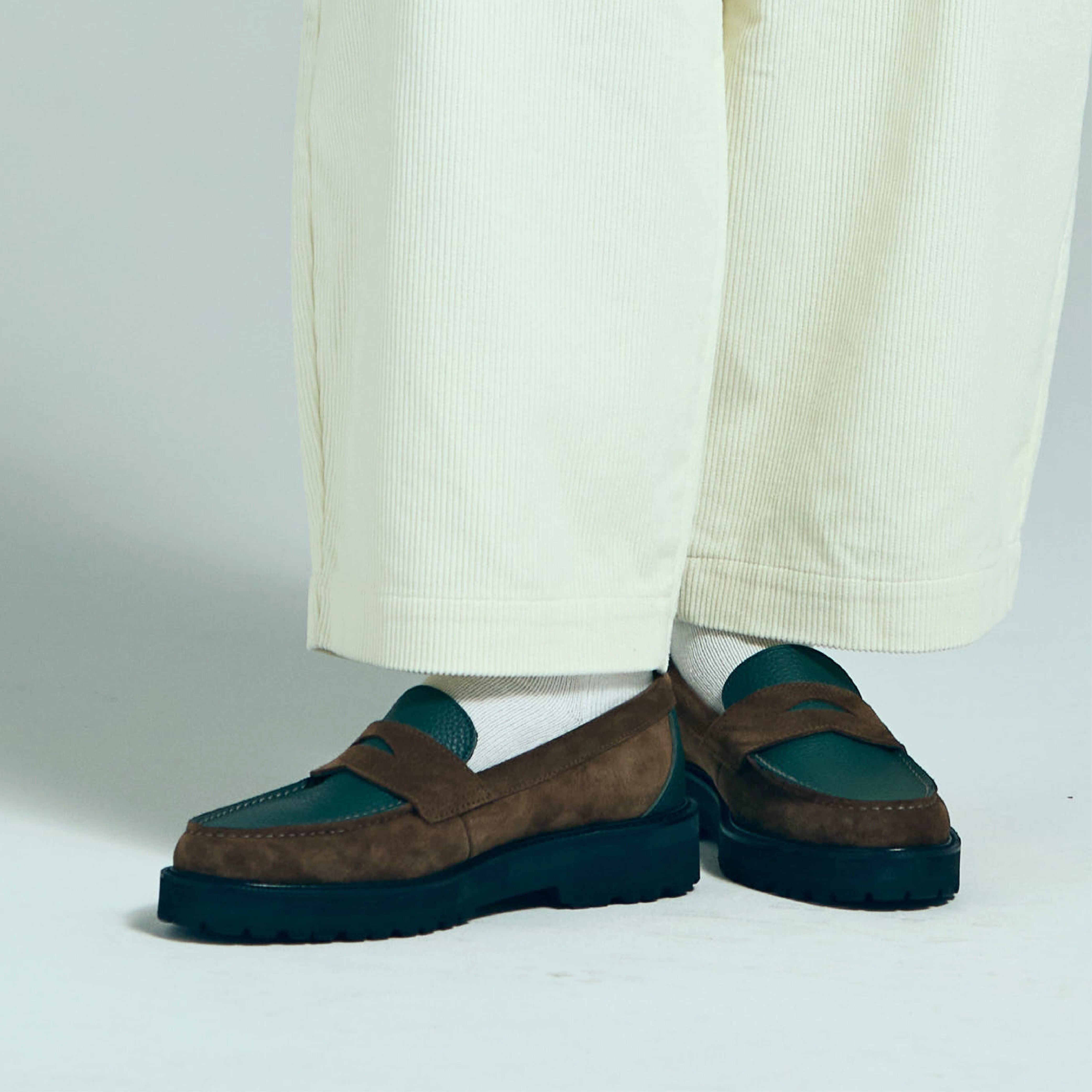グリーンには シボ感の美しいステアレザー、ブラウンには 高級感あふれるスウェード を用い、カラーブロッキングに加え、素材のブロッキングでも格を一段引き上げている。