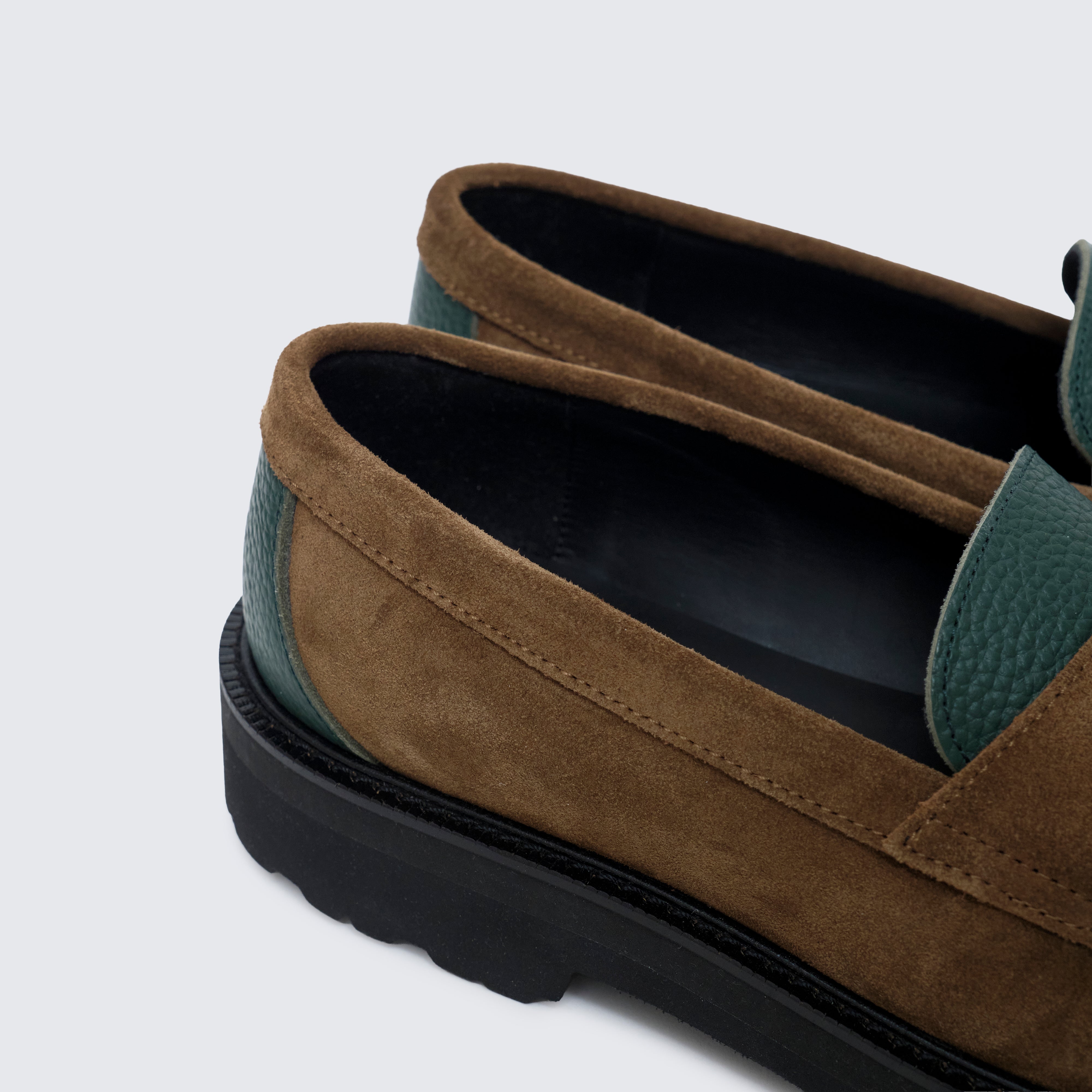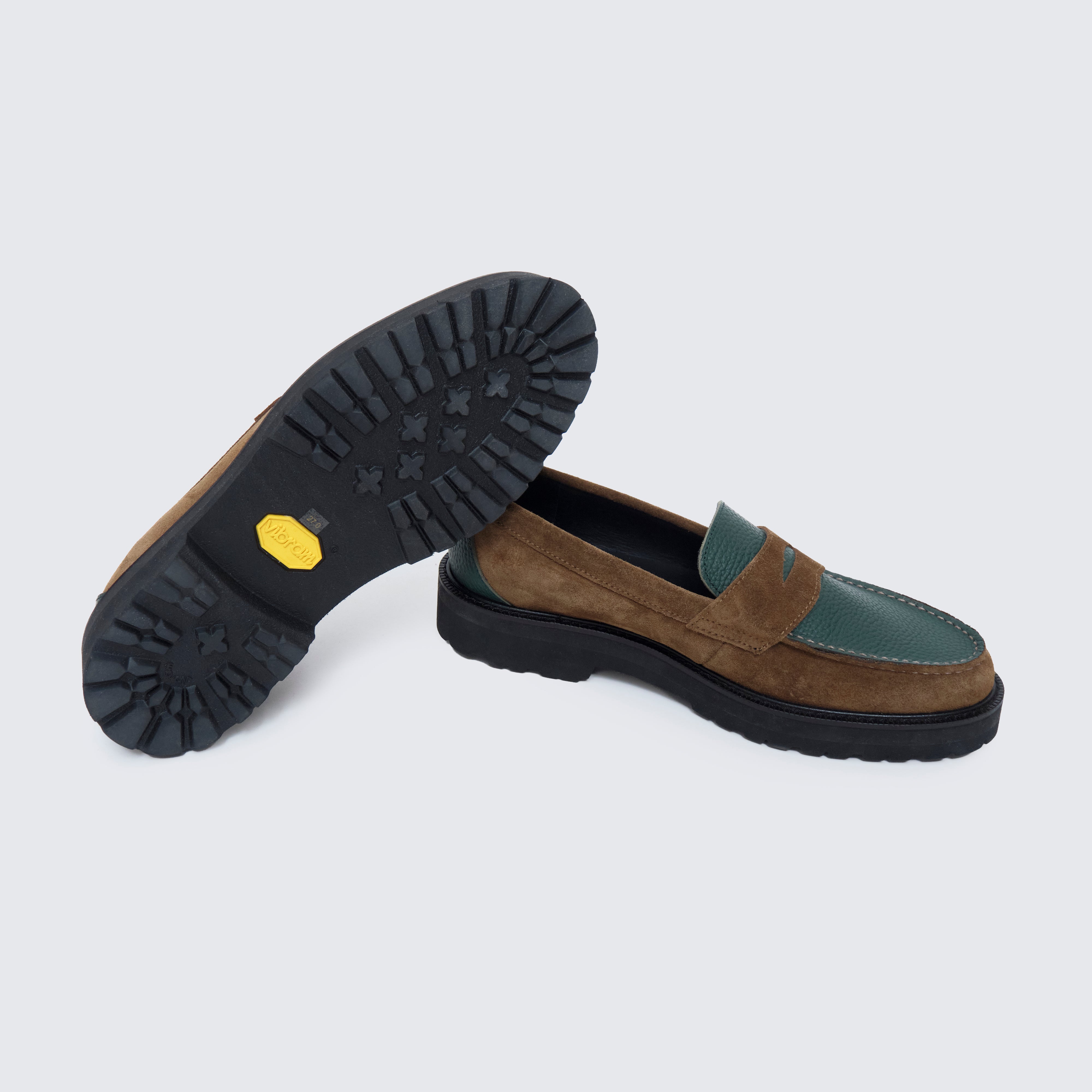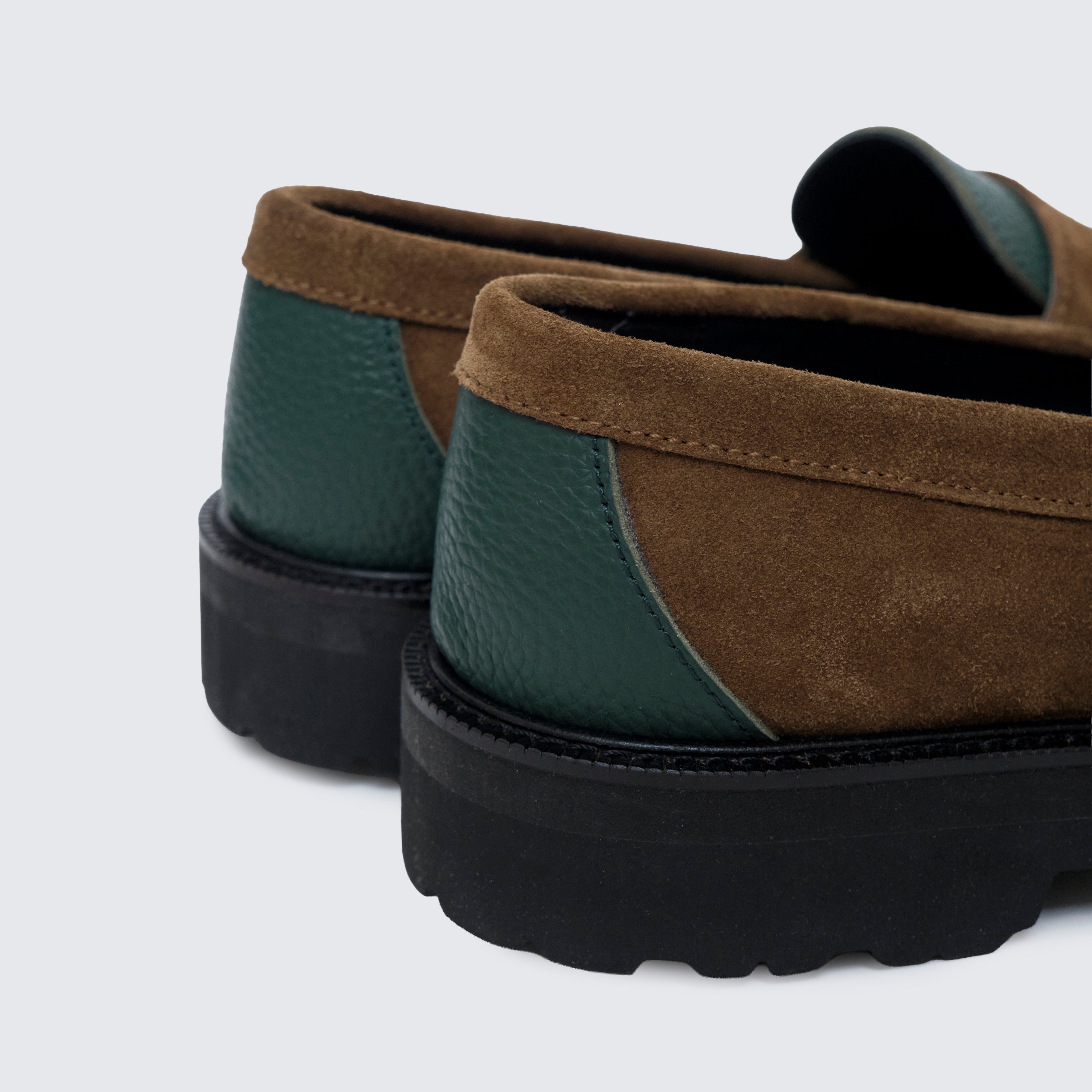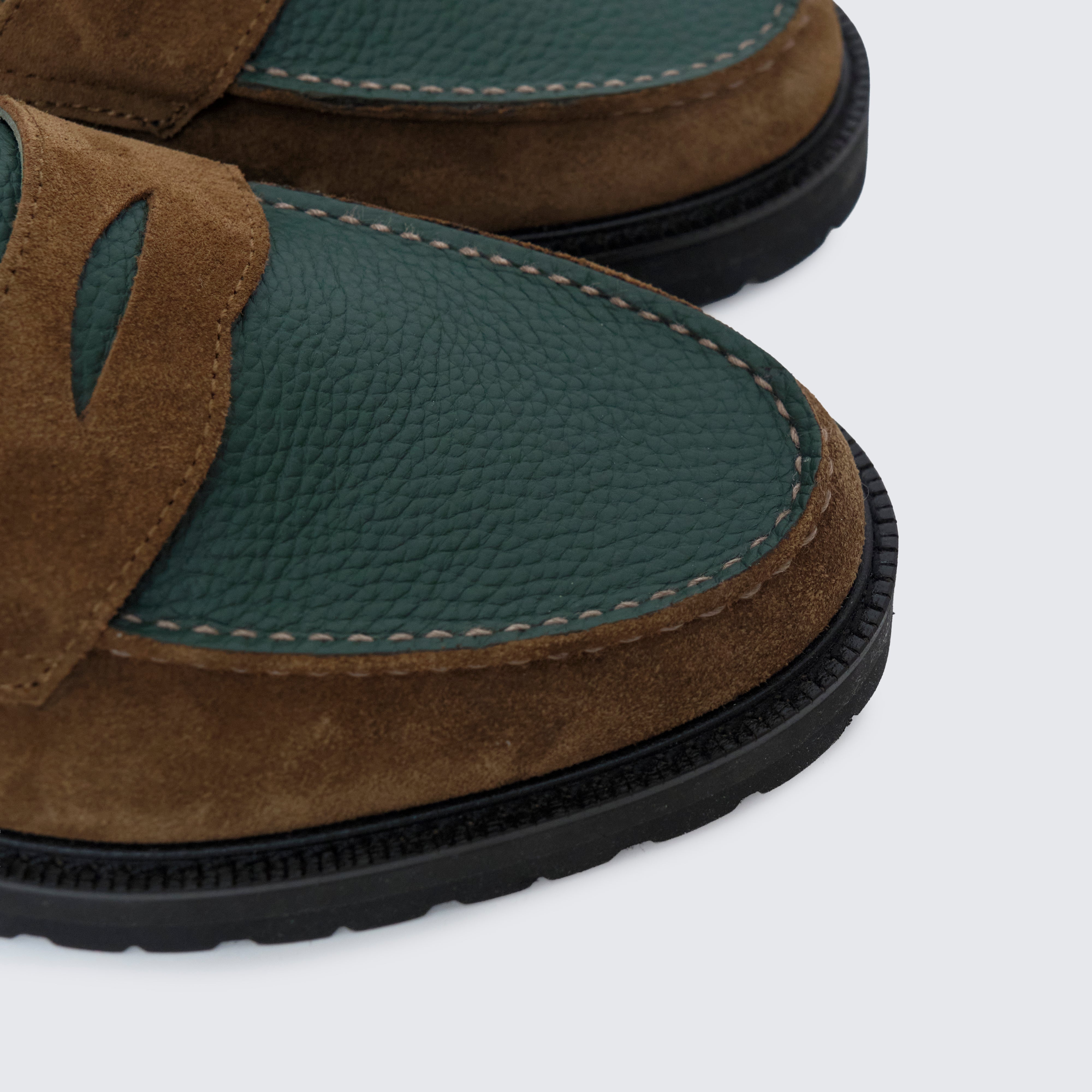 グリーンには シボ感の美しいステアレザー、ブラウンには 高級感あふれるスウェード を用い、カラーブロッキングに加え、素材のブロッキングでも格を一段引き上げている。