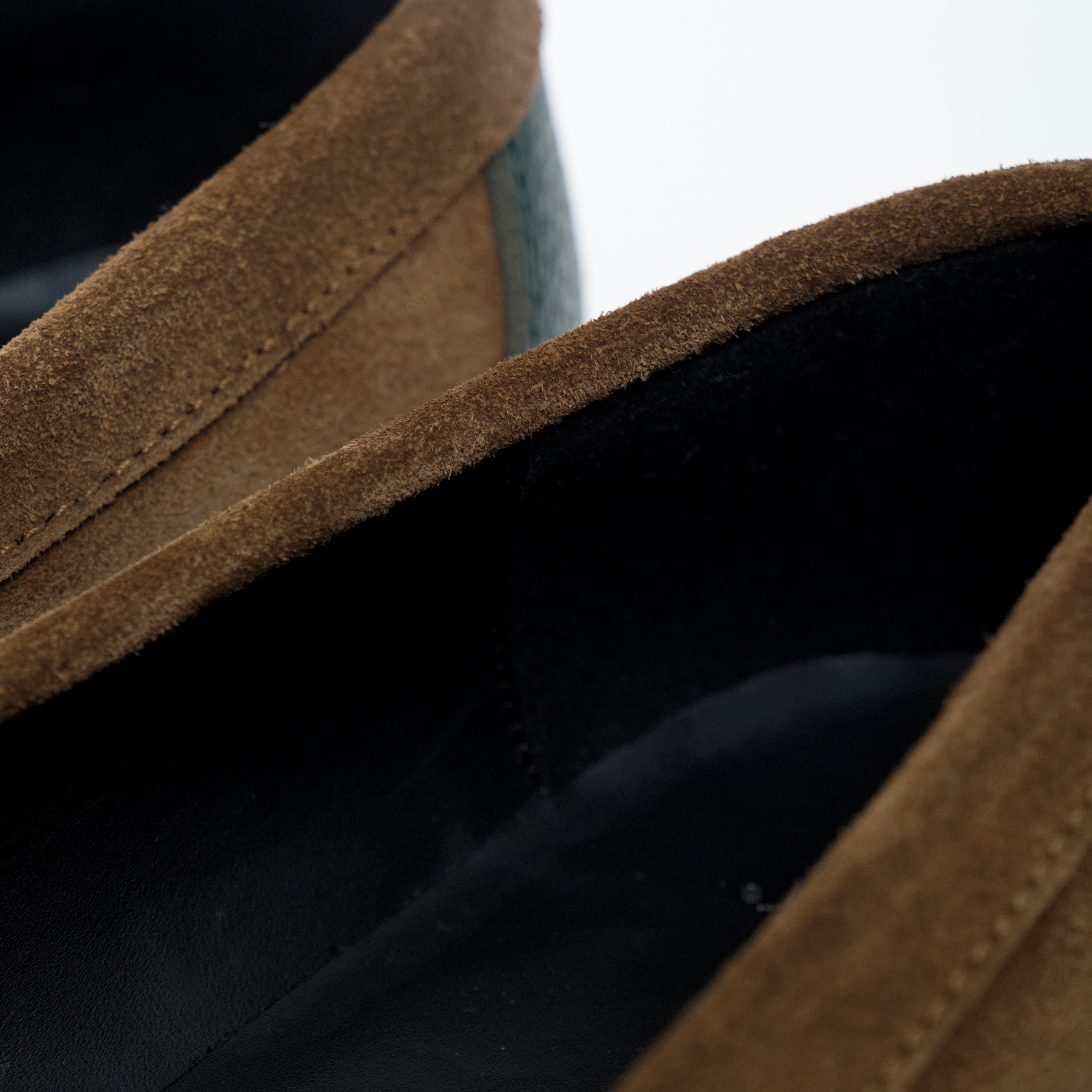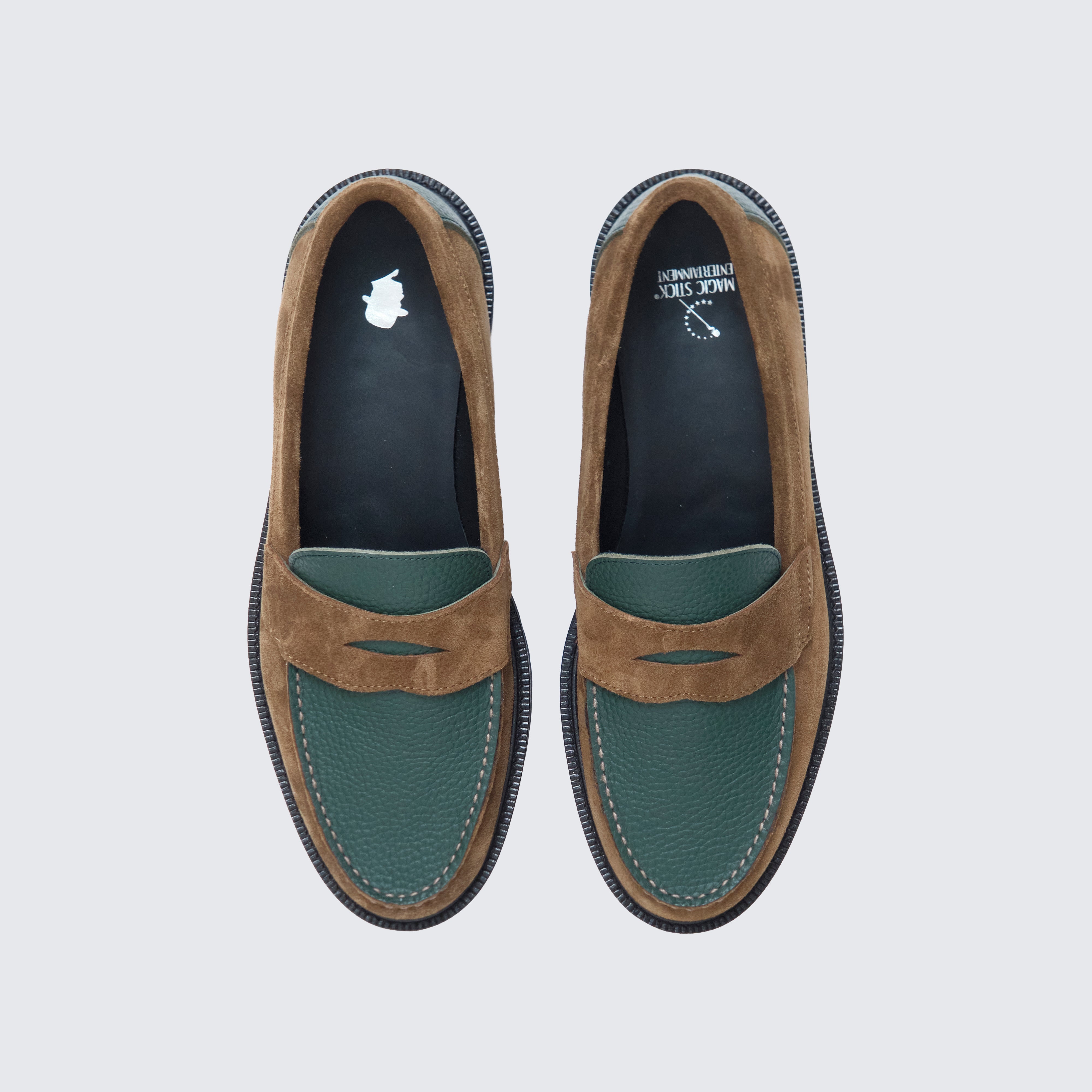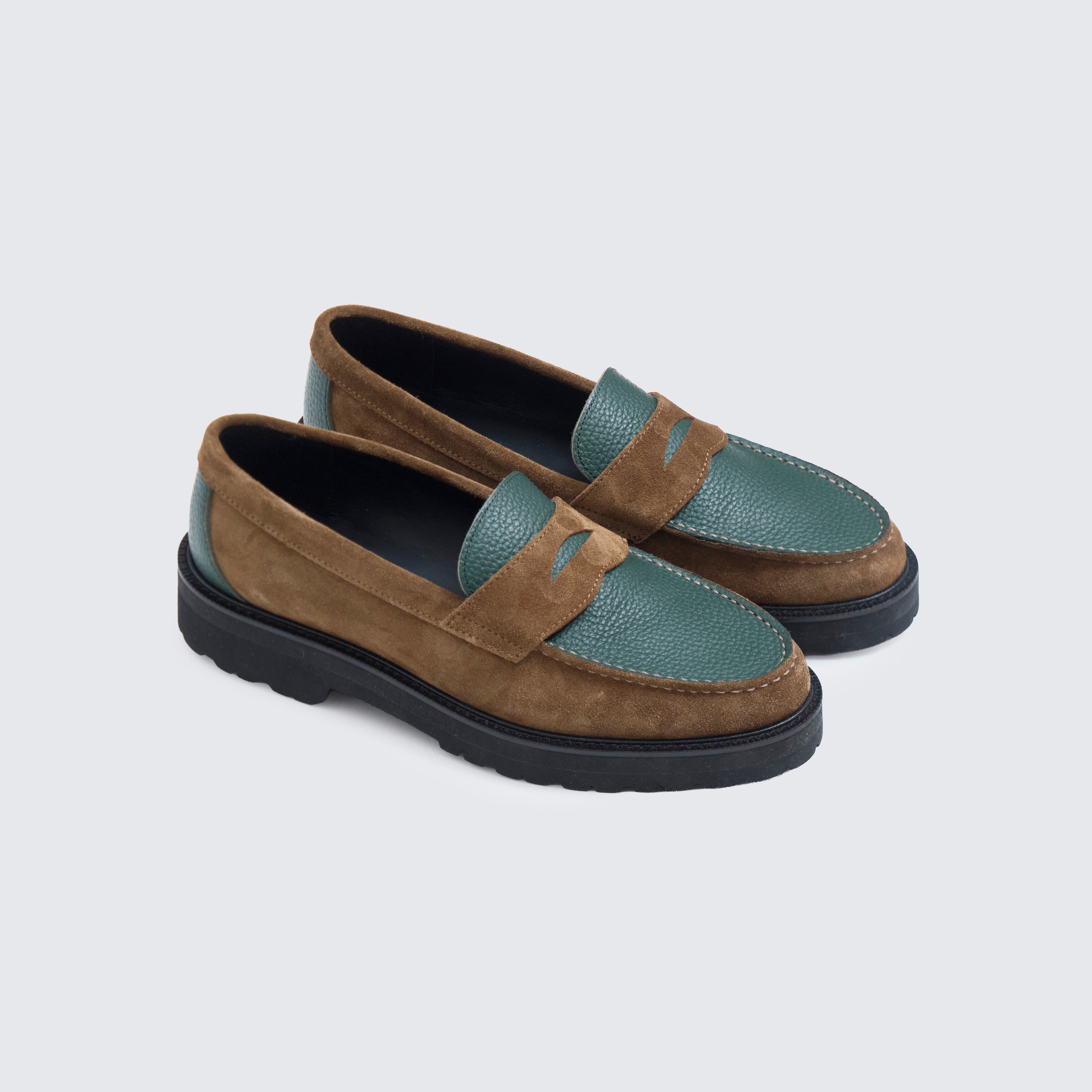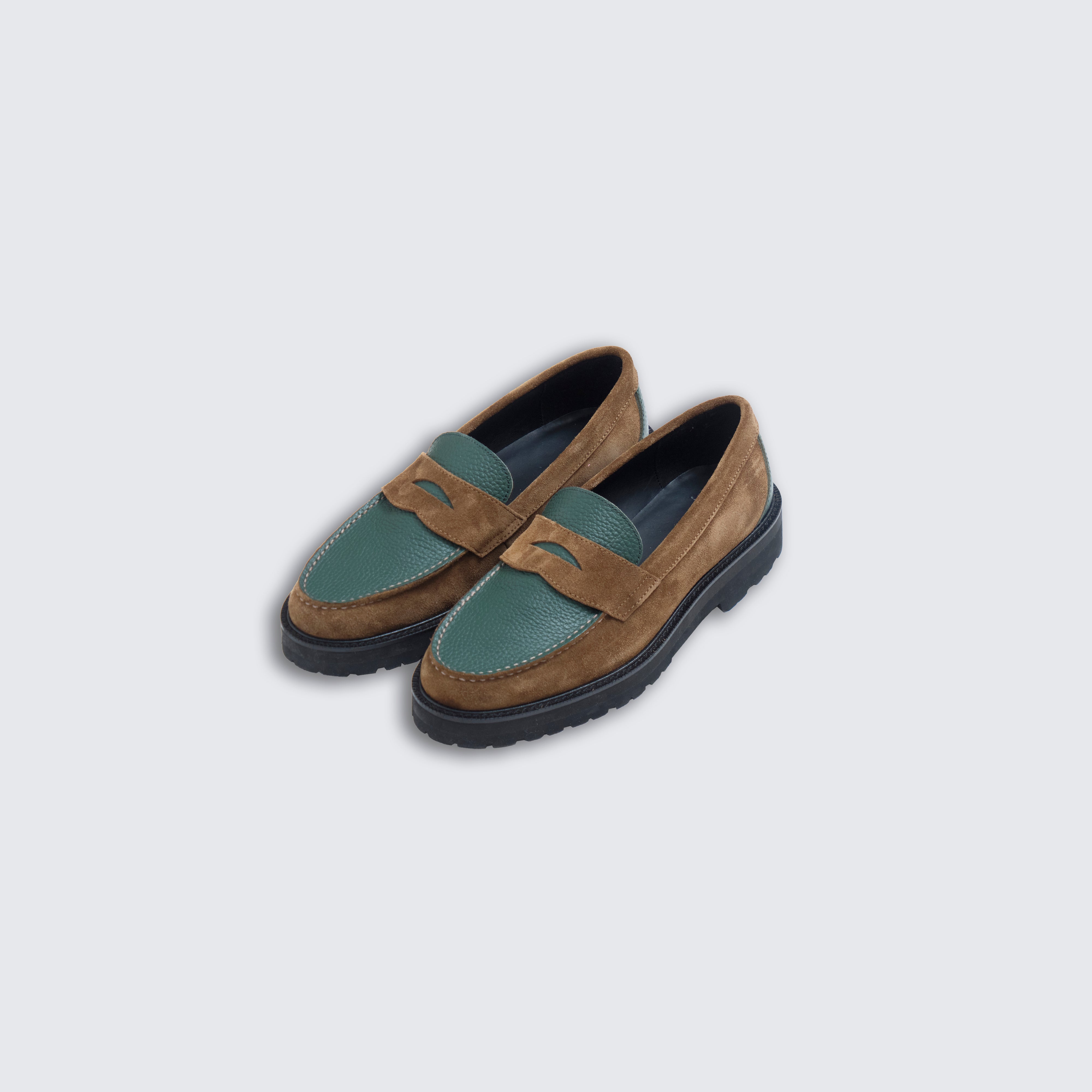 グリーンには シボ感の美しいステアレザー、ブラウンには 高級感あふれるスウェード を用い、カラーブロッキングに加え、素材のブロッキングでも格を一段引き上げている。
